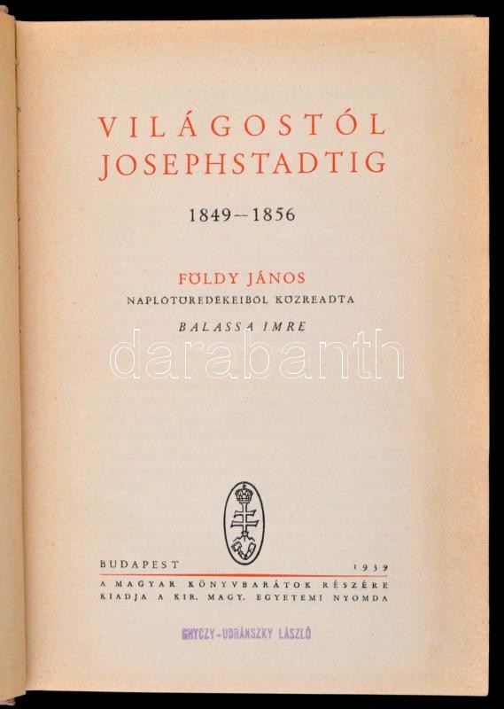 Földy János: Világostól Josephstadtig. 1849-1856. Földy János naplótöredékeiből közreadta Balassa Imre. Bp, 1939, Kir. Magy. Egyetemi Ny. Számos egész oldalas rajzzal illusztrálva. Kiadói egészvászon-kötésben.
