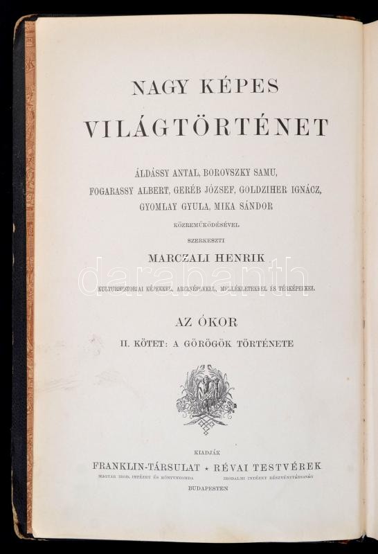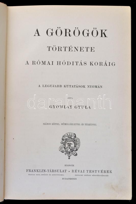 Gyomlay Gyula: A görögök története a római hódítás koráig. Nagy képes világtörténet. Bp., Franklin. Félvászon kötés, festett lapszélek, kopottas állapotban.