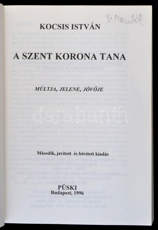Leírás: Kocsis István: A szent korona tana. Múltja, jelene, jövője. Bp., 1996, Püski. Második, javított és bővített kiadás. Kiadói papírkötés.