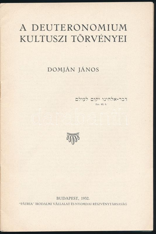 Domján János: A deuteronomium kultuszi törvényei. Bp., 1932, Pátria. K... https://www.darabanth.com/hu/319-Gyorsarveres/319.0/Konyvek/Konyvek-Vallas~1500013/Domjan-Janos-A-deuteronomium-kultuszi-torvenyei-Bp-1932-Patria-Kiadoi-papirkotes-jo~II1759663