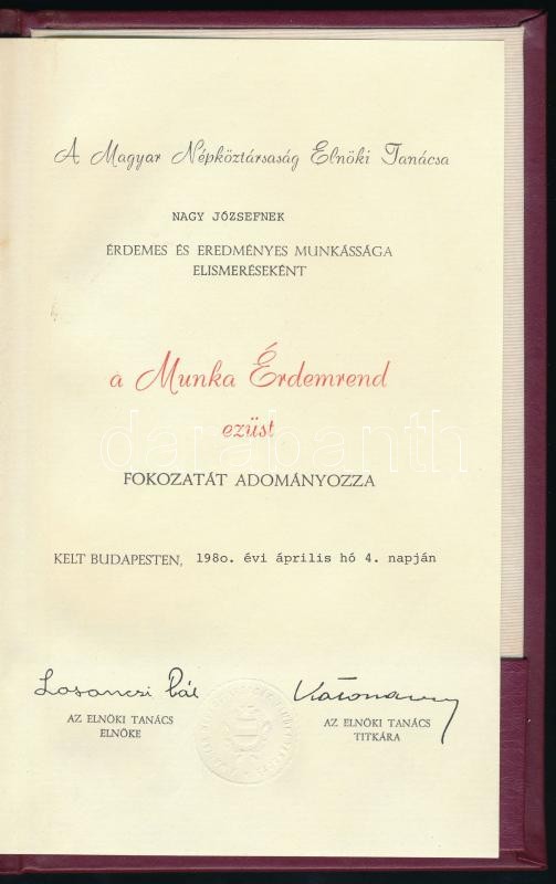 1980. "Munka Érdemrend ezüst fokozata" adományozói okirata https://www.darabanth.com/hu/319-Gyorsarveres/319.0/Numizmatika/Falerisztika-Kituntetesek-jelvenyek~2000019/1980-Munka-Erdemrend-ezust-fokozata-adomanyozoi-okirata~II1636714
