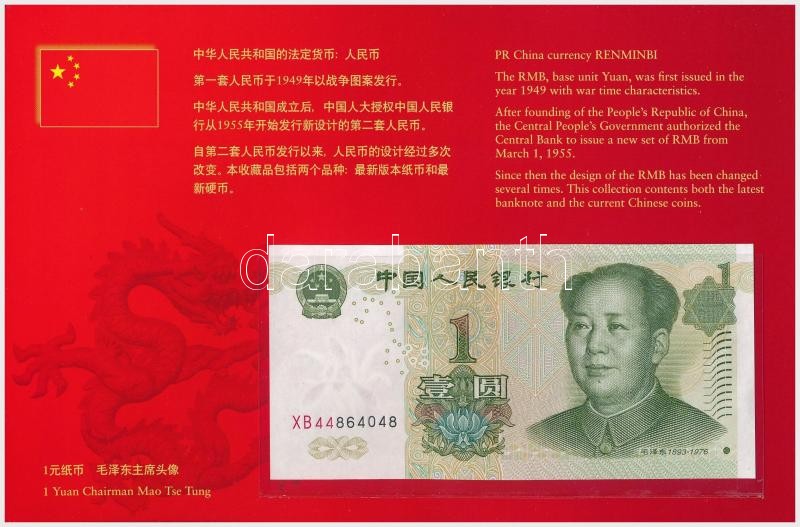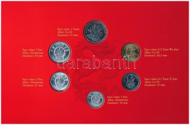 Leírás: Kína 1986-2002. 1f-1Y (6xklf) forgalmi sor + 1999. 1Y bankjegy, karton díszcsomagolásban T:1,I