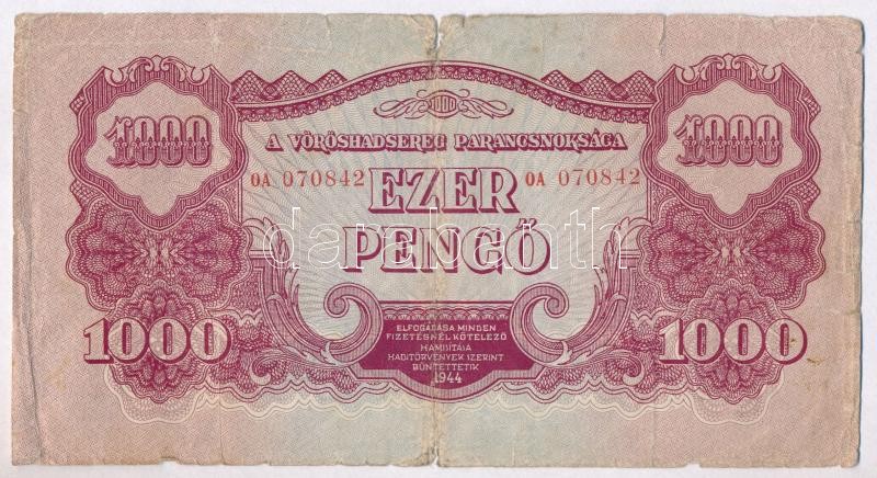 1944. 1000P "A Vöröshadsereg Parancsnoksága" T:III-,IV https://www.darabanth.com/hu/319-Gyorsarveres/319.0/Numizmatika/Magyar-bankjegyek~2000007/1944-1000P-A-Voroshadsereg-Parancsnoksaga-TIII-IV~II1759263