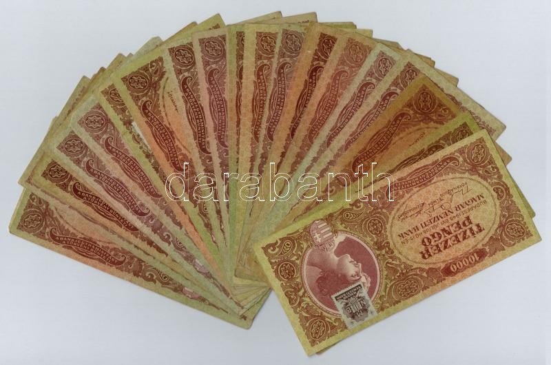 1945. 10.000P (30x) legtöbb "MNB" bélyeggel T:III https://www.darabanth.com/hu/319-Gyorsarveres/319.0/Numizmatika/Magyar-bankjegyek~2000007/1945-10000P-30x-legtobb-MNB-belyeggel-TIII~II1754998