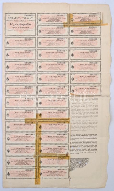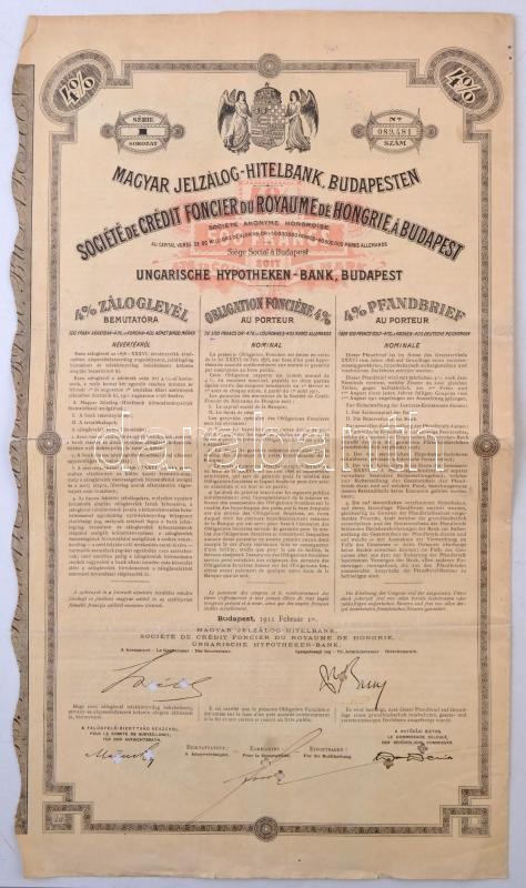 Leírás: Budapest 1911. "Magyar Jelzálog-Hitelbank" 4%-os Záloglevele 500Fr-ról szelvényekkel, bélyegzéssel, szárazpecséttel, lyukasztással érvénytelenítve T:III,III- ragasztás