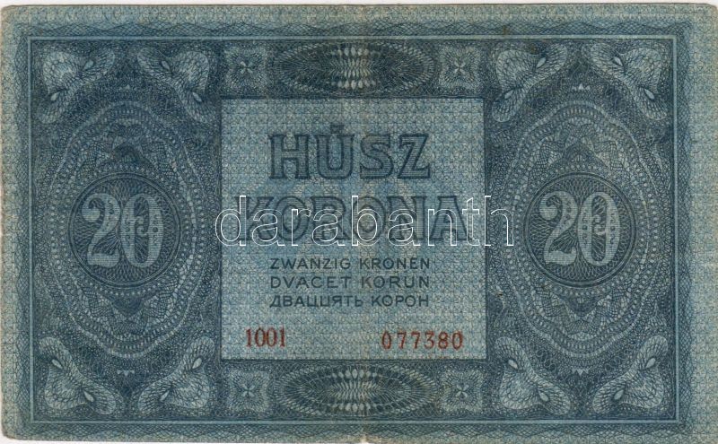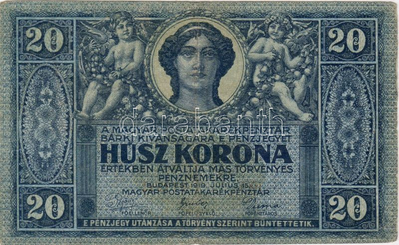 1919. július 15. 20K T:III+ https://www.darabanth.com/hu/32-Gyorsarveres/32.0/Numizmatika/Magyar-es-kulfoldi-bankjegyek~155/1919-julius-15-20K-TIIIplus~II63737