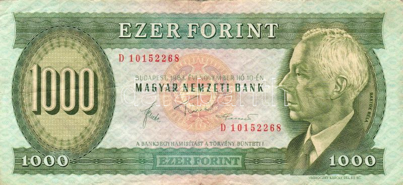 1983.nov.11. 1000Ft "D" T:II/III https://www.darabanth.com/hu/32-Gyorsarveres/32.0/Numizmatika/Magyar-es-kulfoldi-bankjegyek~155/1983nov11-1000Ft-D-TIIIII~II62163