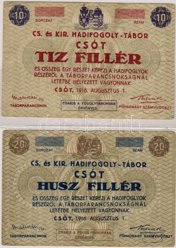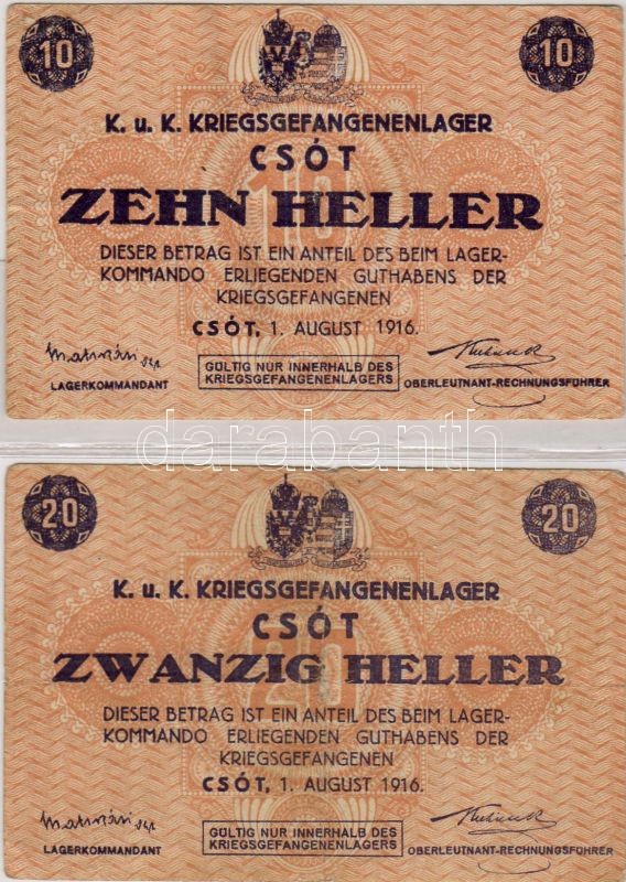 1916. Csót/ hadifogolytábor 10f,20f T:II/III https://www.darabanth.com/hu/32-Gyorsarveres/32.0/Numizmatika/Papirpenzek-szuksegpenzek-hadifogolypenzek-penzhelyettesito-eszkozok~156/1916-Csot-hadifogolytabor-10f-20f-TIIIII~II63732
