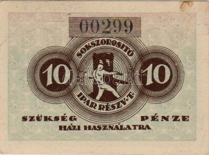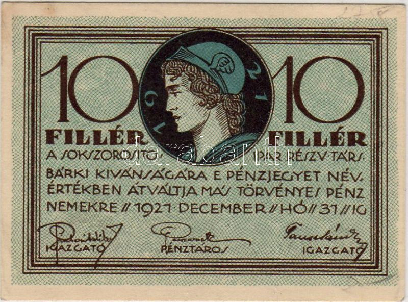 1921. Sokszorosító Ipar RT. 10f T:II+ https://www.darabanth.com/hu/32-Gyorsarveres/32.0/Numizmatika/Papirpenzek-szuksegpenzek-hadifogolypenzek-penzhelyettesito-eszkozok~156/1921-Sokszorosito-Ipar-RT-10f-TIIplus~II63741