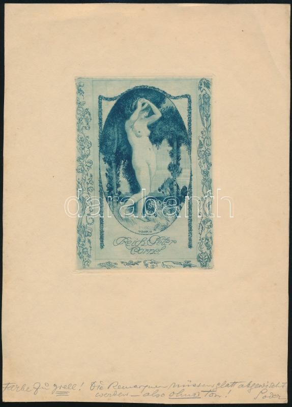 Leírás: Alfred Soder (1880-1957): Erotikus ex libris Reich Péter Cornel Színes rézkarc, papír, jelzett (utasításokkal), 11,5×8 cm