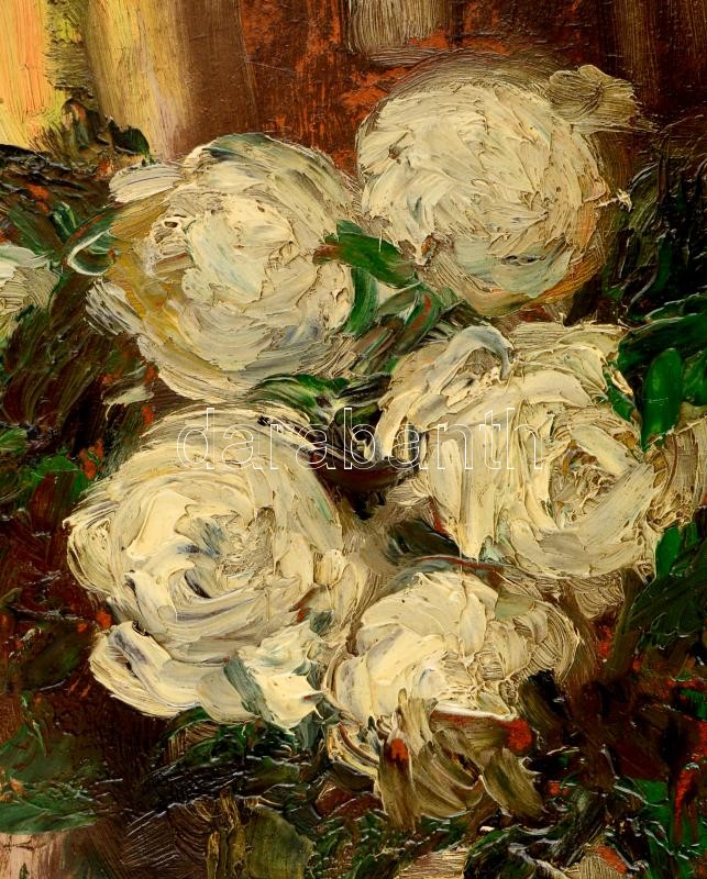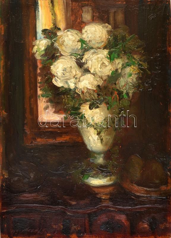 Leírás: Aczél Henrik Emil (1876-1946): Virágcsendélet. Olaj, karton, jelzett, restaurált, 44×31 cm