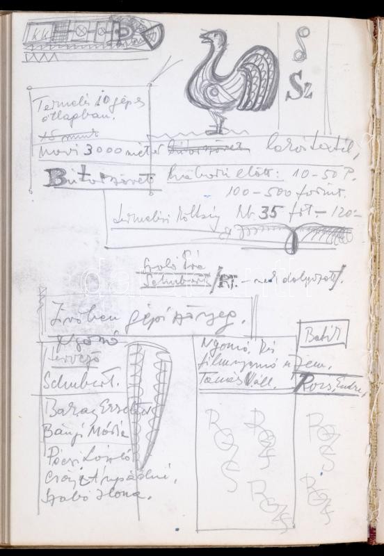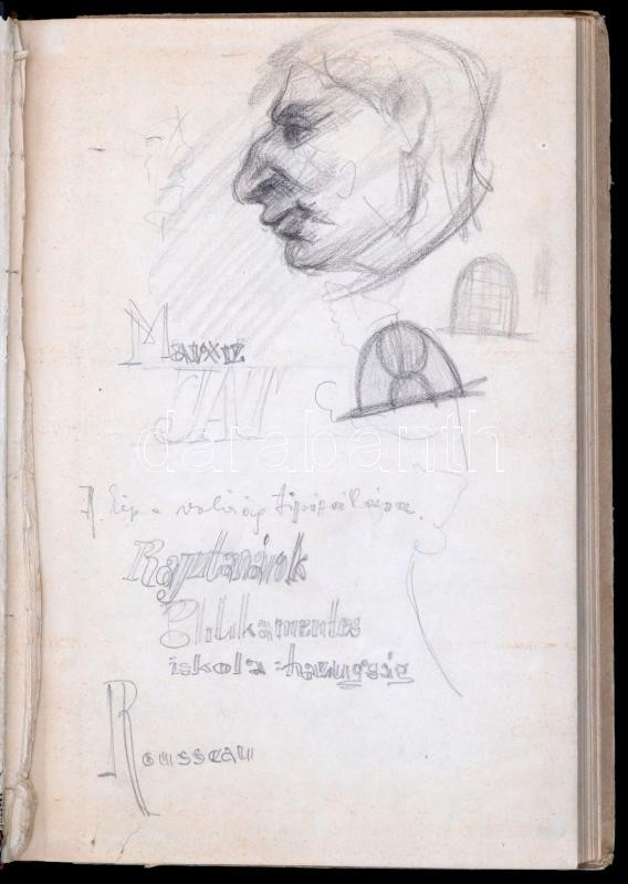Leírás: Z. Gács György (1914-1978): Vázlatkönyv karikatúrákkal, vázlatokkal híres emberekről, jegyzetekkel művészeti témában.