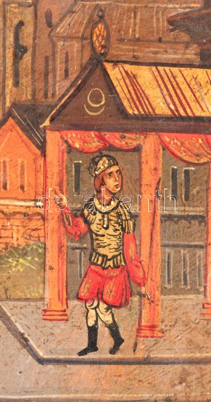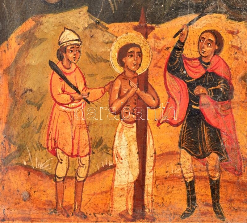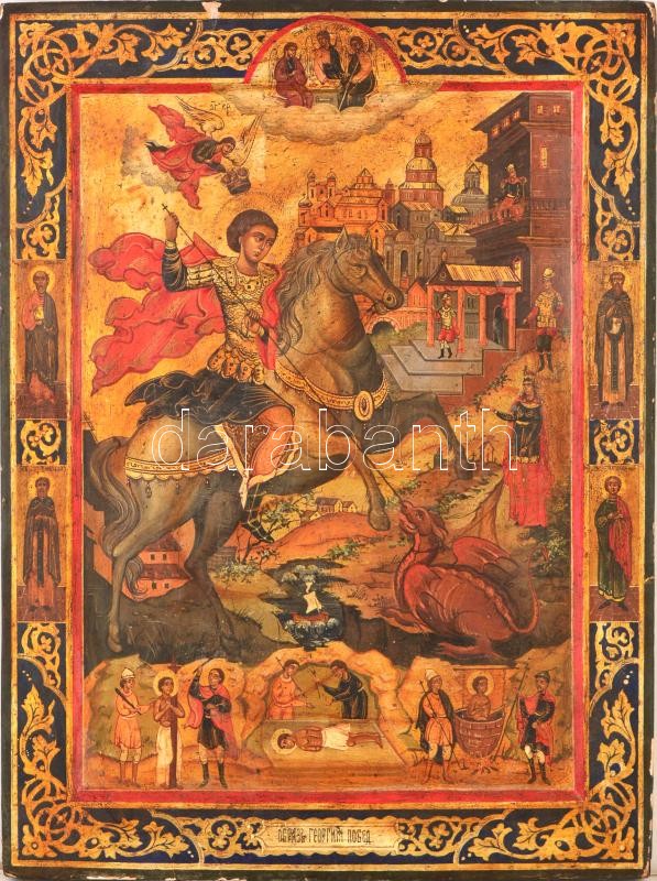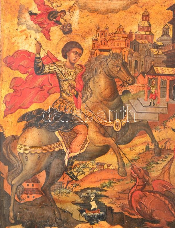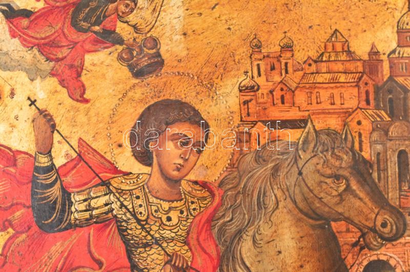 cca 1900 Jelzés nélkül: Győzedelmes Szent György, orosz ikon, tojástempera, fa, kis lepattanásokkal, 39×29,5 cm cca 1900 Georgiy Pobedonosets, Saint George the Victorious, Russian icon, egg tempera, on wood, with minor faults, 39×29,5 cm