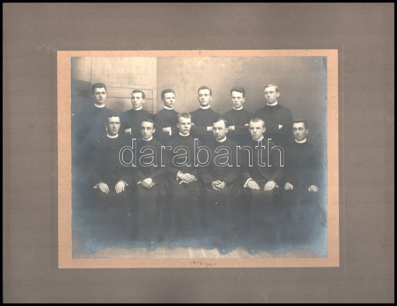 1917. június 6. Knebel szombathelyi fényképész műtermében készült csoportkép - vélhetően - végzett papnövendékekről, kasírozva, hideg pecséttel jelzett, 19,3x24,3 cm, karton 32x38 cm