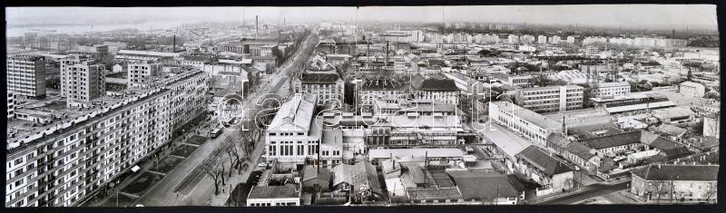 Leírás: 1973 Budapest, XIII. kerület látképe, panorámafénykép, sérüléssel, 16×58 cm