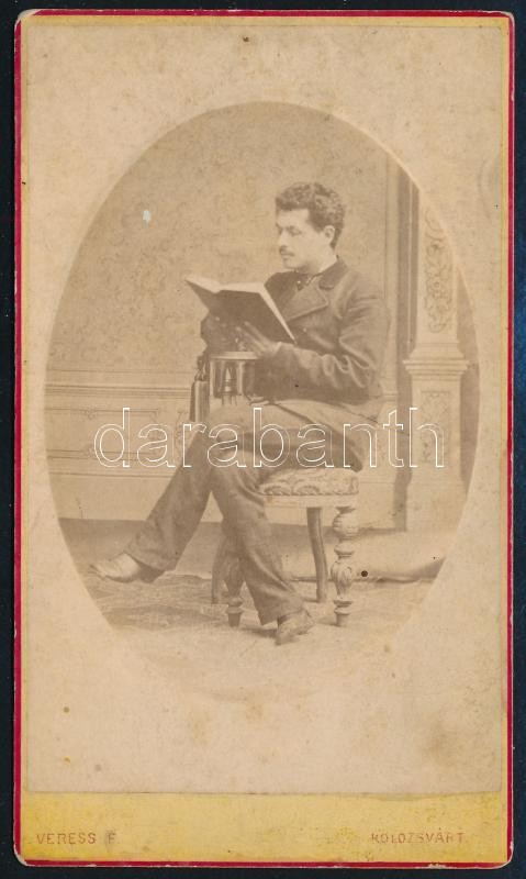 cca 1880 Fiatal férfi műtermi portréja Veress Ferenc (1832-1916) kolozsvári műterméből, dombornyomott porcelánkép utánzatú fénykép, hátoldalon a műterem képével, 10,5×6 cm