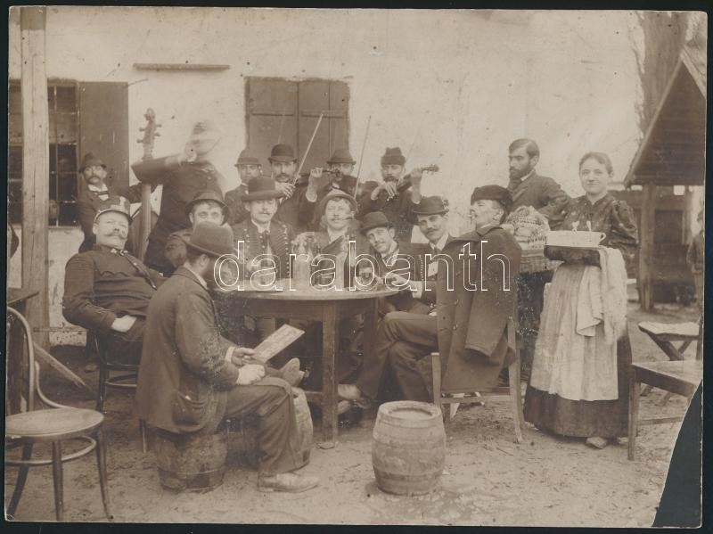 Leírás: cca 1900 Mulatozó társaság cigányzenészekkel, a fogyasztást a társaság egy zsidó tagja ellenőrzi, kartonra ragasztott fotó, kis kopásokkal, 16,5×22 cm