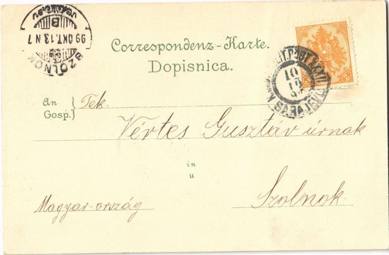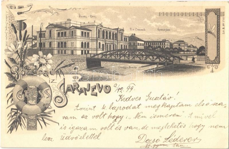 Leírás: 1899 Sarajevo, Vereins Haus, Div. Comando, Gymnasium / grammar school, Division Command, cooperative house. J. Lederer Art Nouveau, floral, litho