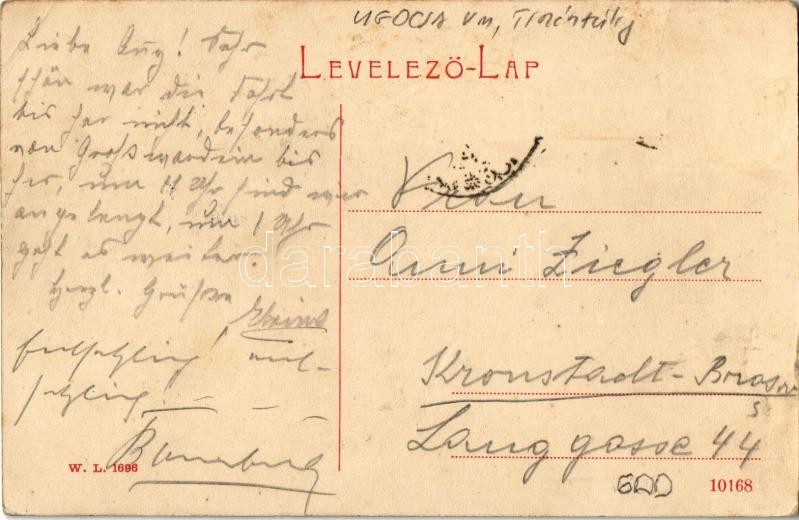 Leírás: Halmi, Halmeu; Községháza, tér, "Duna" Biztosító Társaság ügynöksége. W.L. 1696. / town hall, square, insurance company (EK)