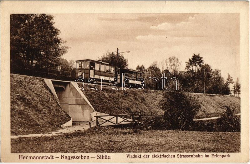 Nagyszeben, Hermannstadt, Sibiu; Villamos viadukt az Erlen parkban. Jos. Drotleff és Emil Fischer kiadása / Viadkut der elektrischen Strassenbahn / tram viaduct in the park