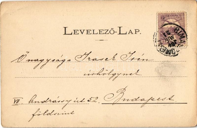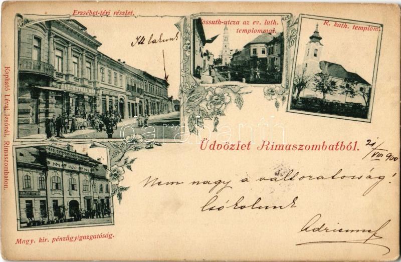 1900 Rimaszombat, Rimavská Sobota; Erzsébet tér, Kossuth utca, Római katolikus és evangélikus lutheránus templomok, Magyar királyi pénzügyigazgatóság, Glückstahl Mór, Skolczy István és Heksch Bertalan üzlete / square, street, churches, shops, Financial Directorate. Art Nouveau, floral (EK)