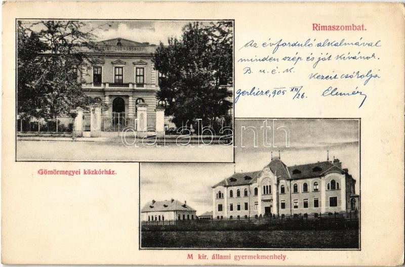 Leírás: 1905 Rimaszombat, Rimavská Sobota; Gömör megyei közkórház, M. kir. állami gyermekmenhely / hospital and orphanage