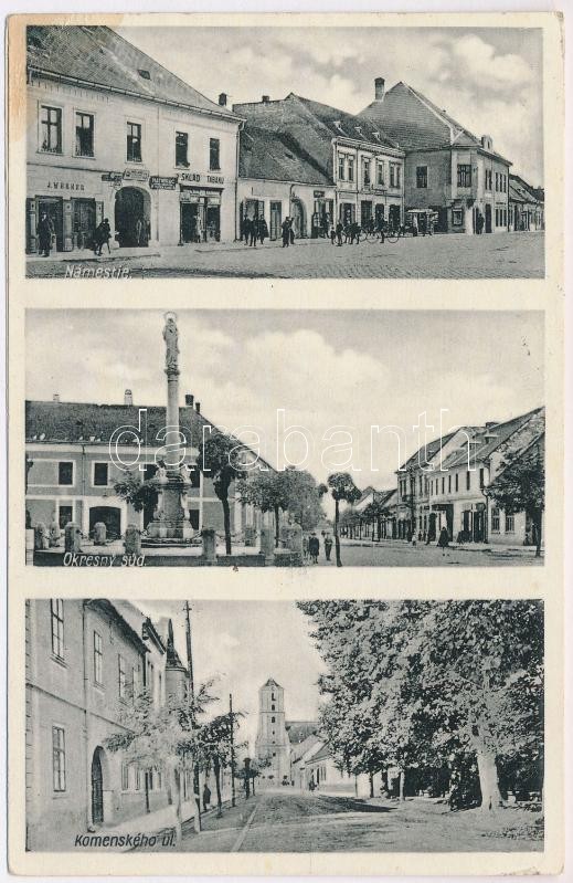 1934 Bazin, Bösing, Bözing, Pezinok; Fő tér, Járásbíróság, utca, szobor, J. Werner üzlete, dohánybolt . M. Proksa kiadása / Námestie, Okresny súd, Komenského ul., Natierac, Sklad Tabaku / street, square, county court, shops, statue