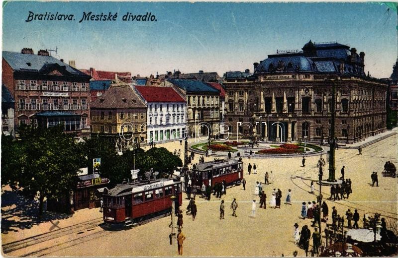 Pozsony, Pressburg, Bratislava; Mestské divadlo / Sétatér, színház, vi... https://www.darabanth.com/hu/32-Nagyaukcio/32.1/Kepeslapok/Felvidek~13727/Pozsony-Pressburg-Bratislava-Mestske-divadlo-Setater-szinhaz-villamos-Stollwerck-reklam~II2037495