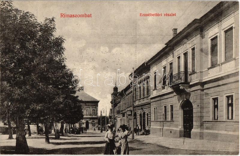 Leírás: Rimaszombat, Rimavská Sobota; Erzsébet tér, Fogyasztási szövetkezet üzlete. Ifj. Rábely Miklós kiadása / square with cooperative shop