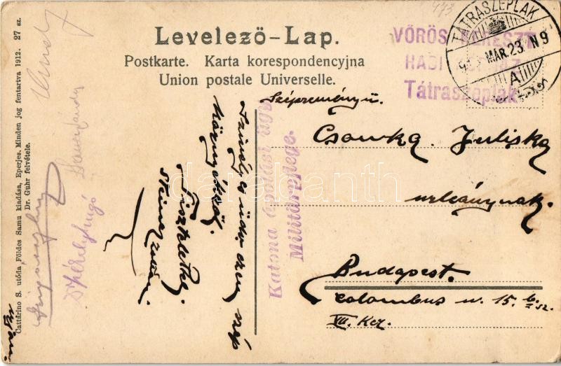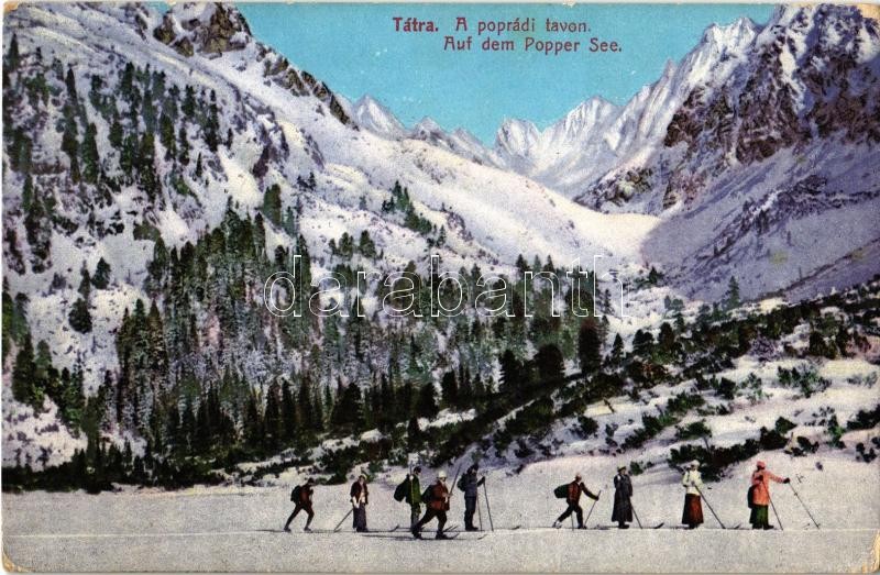 Tátra, Vysoké Tatry; síelők a befagyott Poprádi tavon, téli sport. Cattarino S. utóda Földes Samu kiadása / skiers on the frozen Popradske pleso lake, winter sport, skiing + "Vöröskeresztes Hadi Kórház Tátraszéplak katonai ápolási ügy"