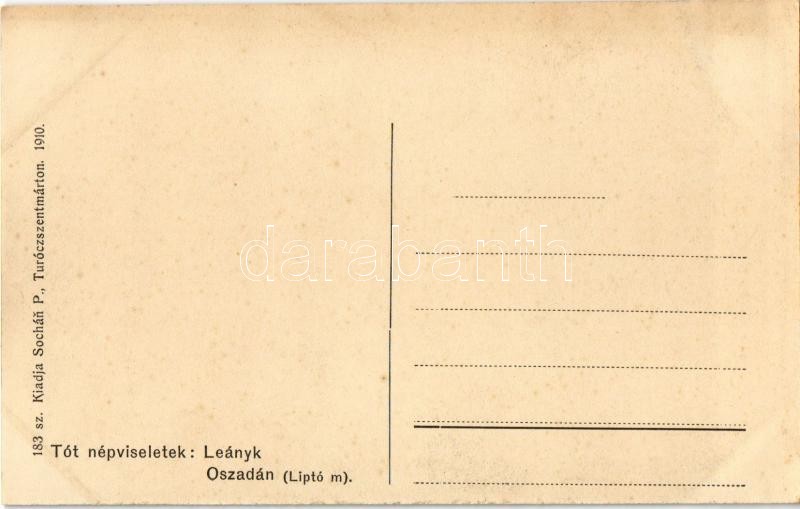 Tót népviseletek: leányok Oszadán (Liptó m.). Sochán P. 1910. 183. / S... https://www.darabanth.com/hu/32-Nagyaukcio/32.1/Kepeslapok/Folklor~13794/Tot-nepviseletek-leanyok-Oszadan-Lipto-m-Sochan-P-1910-183-Slovakian-folklore-from-L~II2037744
