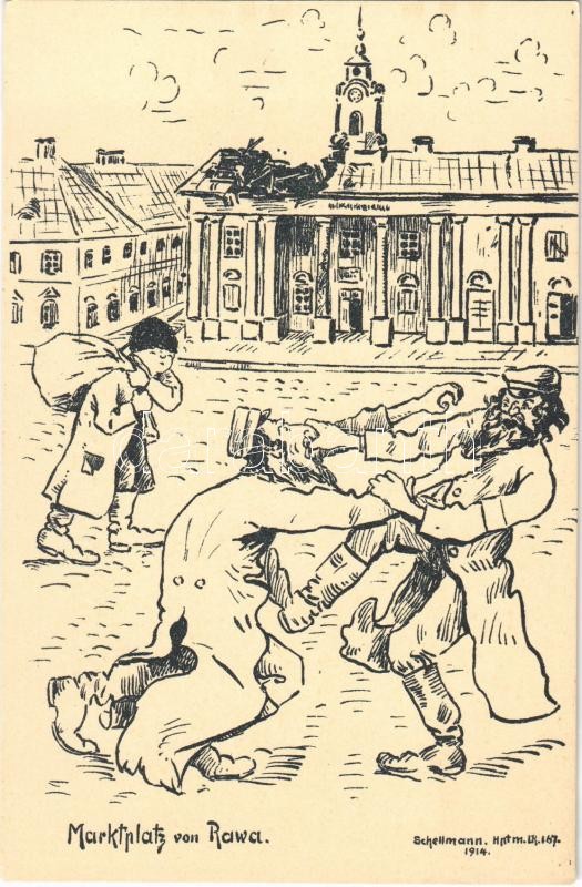 Leírás: Marktplatz von Rawa. Genehmigt 3. XI. / Jewish men fighting in Rava-Ruska. Judaica humour s: Schellmann