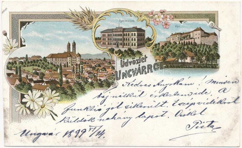 Leírás: 1899 (Vorläufer!) Ungvár, Uzshorod, Uzhorod; gimnázium, vár, templom / grammar school, castle, church. Art Nouveau, floral, litho (vágott / cut)