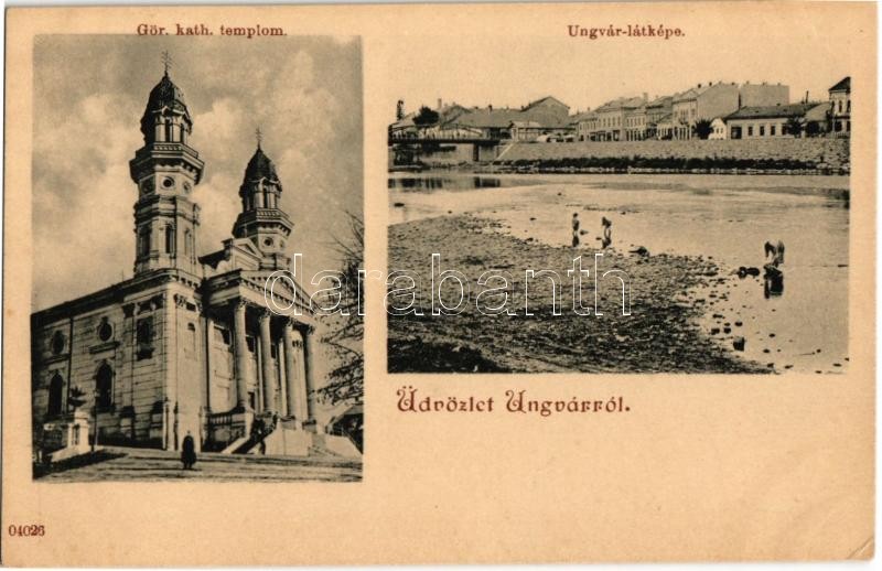 Ungvár, Uzshorod, Uzhorod; Görögkatolikus templom, székesegyház, látkép az Ung folyóban fürdőzőkkel, híd / Greek Catholic Cathedral, general view with bathing people in River Uzh, bridge (EK)