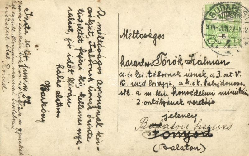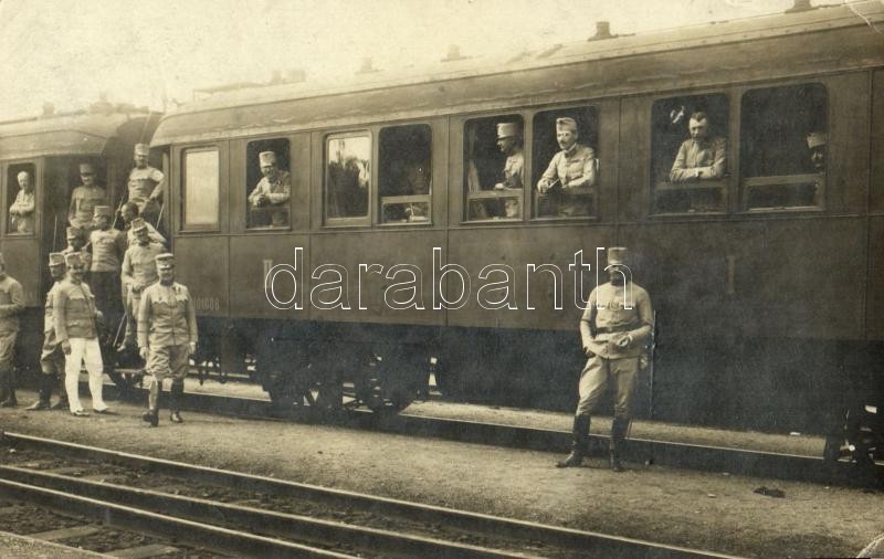1914 Inota, vasútállomás harctérre induló katonákkal a vonaton. Levél Haraszti Török Kálmán cs. és kir. tábornok úrnak címezve, a 3. oszt. V.K. rend lovagja, a k.é.é.tulajdonosa stb. a m. kir. honvédelmi ministerium 2. osztályának vezetője / railway station with soldiers heading to the battlefield. photo (EK)