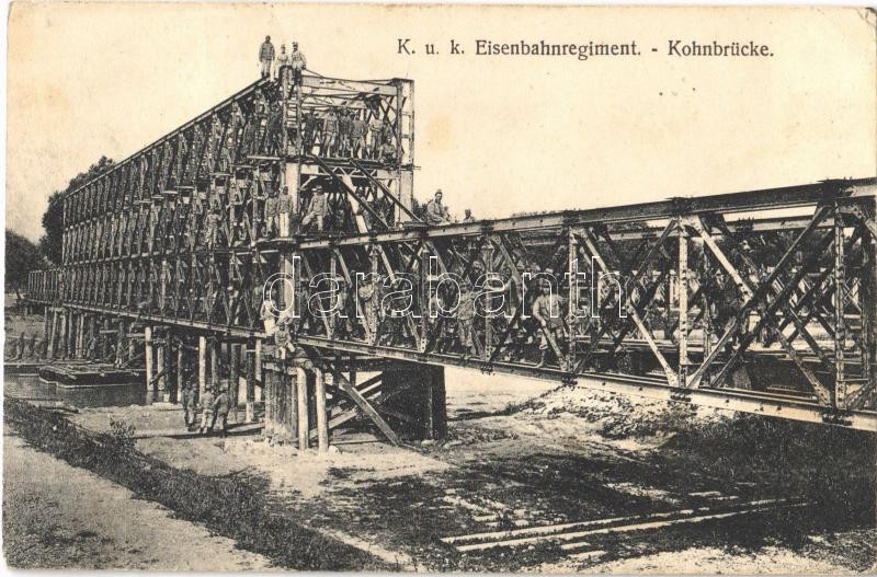 K.u.K. Eisenbahnregiment. Kohnbrücke. Verlag J. L. K. No. 80. / Austro-Hungarian railway regiment, military railway bridge construction, truss bridge with soldiers (EK)
