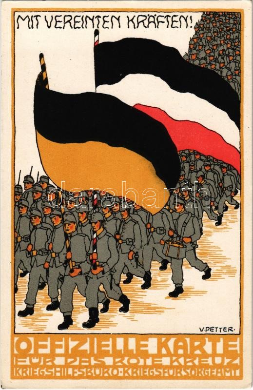 Mit Vereintem Kräften! Offizielle Karte für das Rote Kreuz Kriegshilfsbüro, Kriegsfürsorgeamt / WWI German military propaganda art postcard, litho s: V. Petter