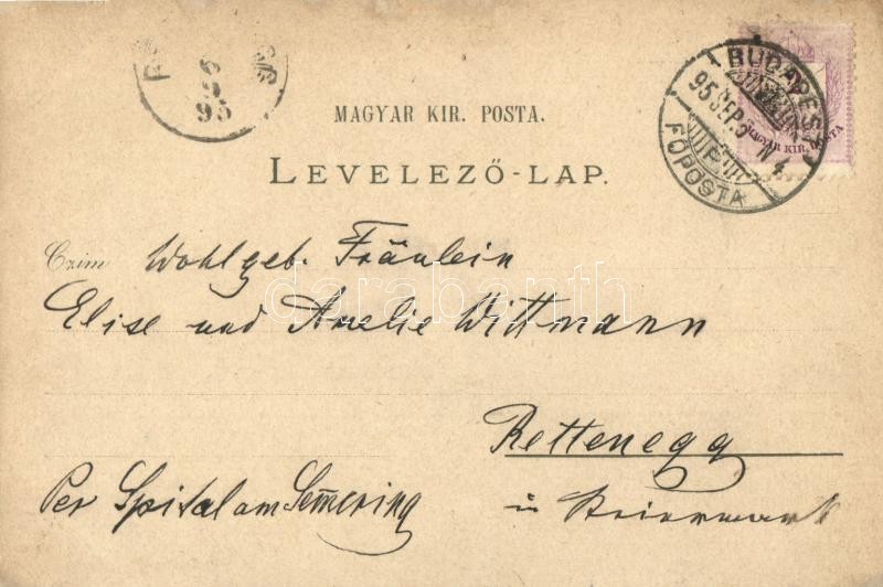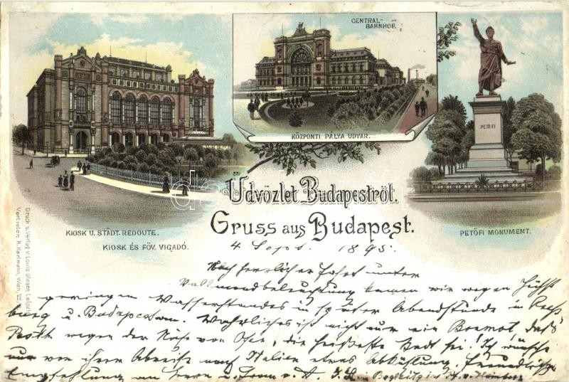 Leírás: 1895 (Vorläufer!) Budapest, Központi (Keleti) pályaudvar, Petőfi szobor, Kioszk és fővárosi vigadó. Louis Glaser Art Nouveau, floral, litho (r)