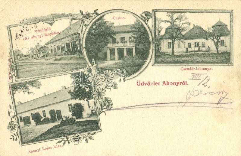 Leírás: 1900 Abony, Kaszinó, Csendőrlaktanya, Vendéglő az abonyi tanyához, Abonyi Lajos háza. Kiadja Vörös László, Art Nouveau floral