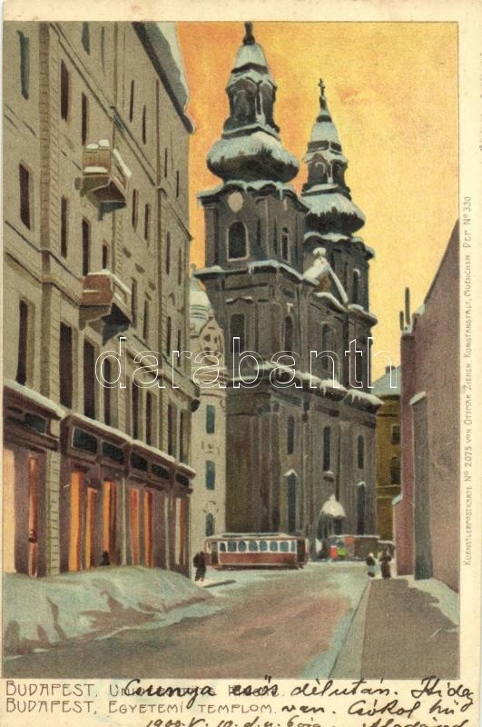 1900 Budapest V. Egyetemi templom, villamos télen. Kuenstlerpostkarte ... https://www.darabanth.com/hu/32-Nagyaukcio/32.1/Kepeslapok/Magyarorszag~13725/1900-Budapest-V-Egyetemi-templom-villamos-telen-Kuenstlerpostkarte-No-2075-von-Ottmar-Zieher-~II2044361