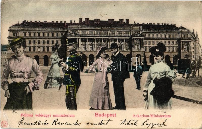 Leírás: 1903 Budapest V. Földművelésügyi Minisztérium. Montázs urakkal és hölgyekkel / Ackerbau Ministerium, montage (EK)