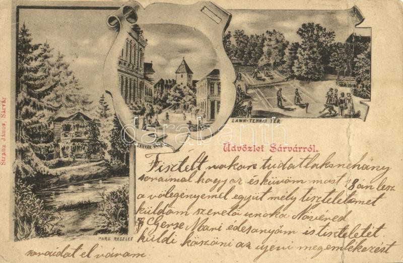 Leírás: 1905 Sárvár, Vár és park, Lawn tennis tér, tenisz pálya teniszezőkkel. Strauz János kiadása, Art Nouveau (fa)
