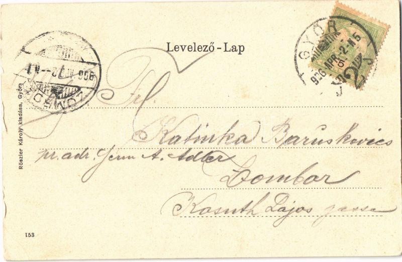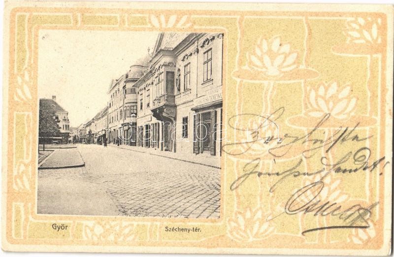Leírás: 1906 Győr, Széchenyi tér, Győri Első Temetkezési Intézet, üzletek. Kiadja Rőszler Károly. Art Nouveau, floral, litho keret (EK)