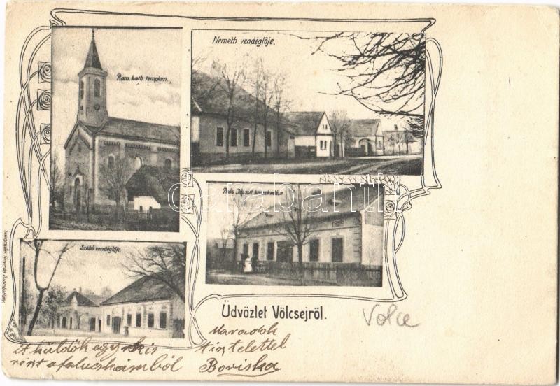 Leírás: 1907 Völcsej (Sopron), Római katolikus templom, Szabó és Németh vendéglői, Poós József kereskedése. Steegmüller fényirda, Art Nouveau (EK)