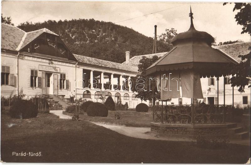 1935 Parád-fürdő, fürdő épület, tejcsarnok, fodrász, zene pavilon. Kar... https://www.darabanth.com/hu/32-Nagyaukcio/32.1/Kepeslapok/Magyarorszag~13725/1935-Parad-furdo-furdo-epulet-tejcsarnok-fodrasz-zene-pavilon-Kartik-Istvan-kiadasa~II2046634
