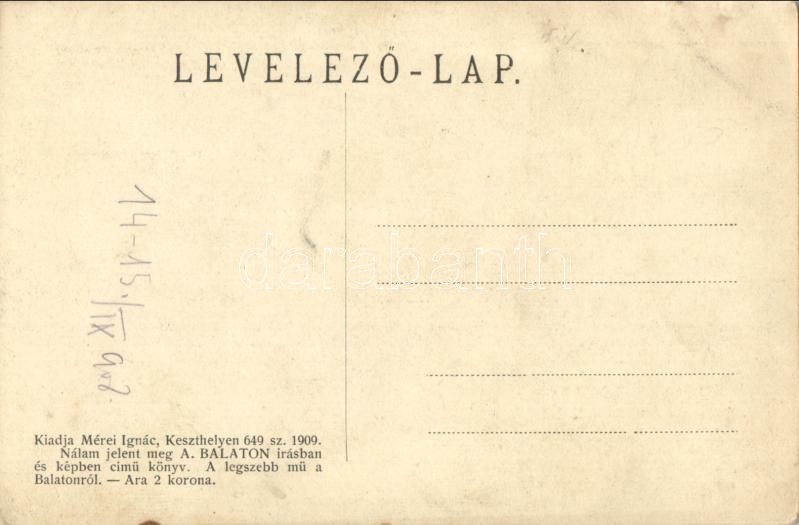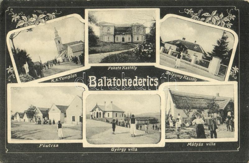 Balatonederics, Római katolikus templom, Fő utca, Fekete és Solyomy kastély, György és Mátyás villa. Mérei Ignác kiadása, Art Nouveau (ázott sarok / wet corner)