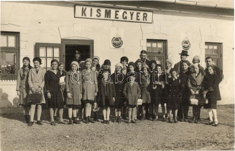 Leírás: Kismegyer (Győr), vasútállomás, gyerekek csoportképe, vasutasok, Schmoll cipőpaszta reklámja a falon. photo