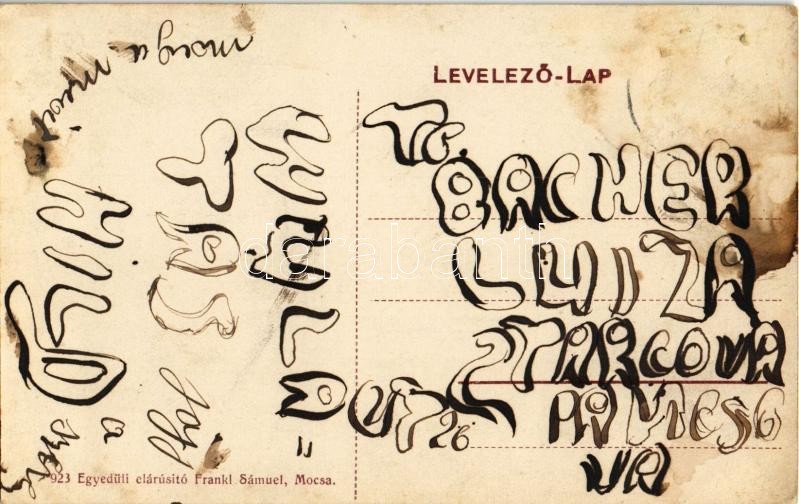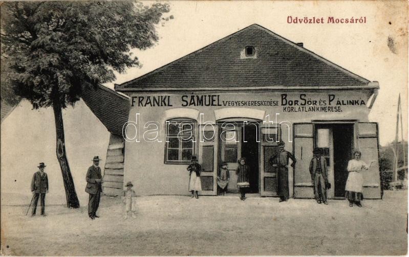 Leírás: Mocsa, Frankl Sámuel vegyeskereskedése, bor, sör és pálinka korlátlan mérése. Egyedüli elárusító Frankl Sámuel (fl)