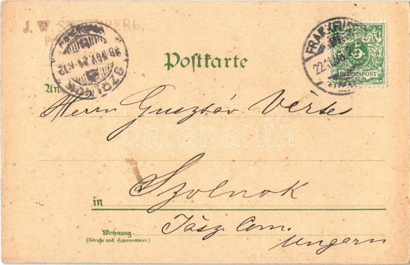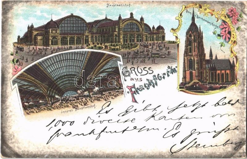 Leírás: 1898 Frankfurt, Hauptbahnhof, Inneres, Dom und Bartholomaus Kirche / railway station interior, dome and church. Art Nouveau, floral, litho