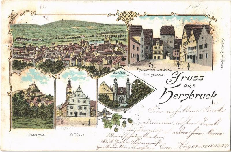 Leírás: 1898 Hersbruck, Schloss, Rathhaus, Hohenstein, Thorparthie vom Markt aus gesehen / castle, town hall, gate. Art Nouveau, floral, litho